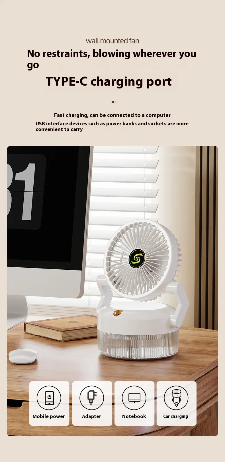 Forget about constantly buying new batteries—this fan is USB rechargeable, making it easy to charge with your laptop, power bank, or wall adapter. This makes it a convenient and eco-friendly option for staying cool at home, in the office, or while traveling.