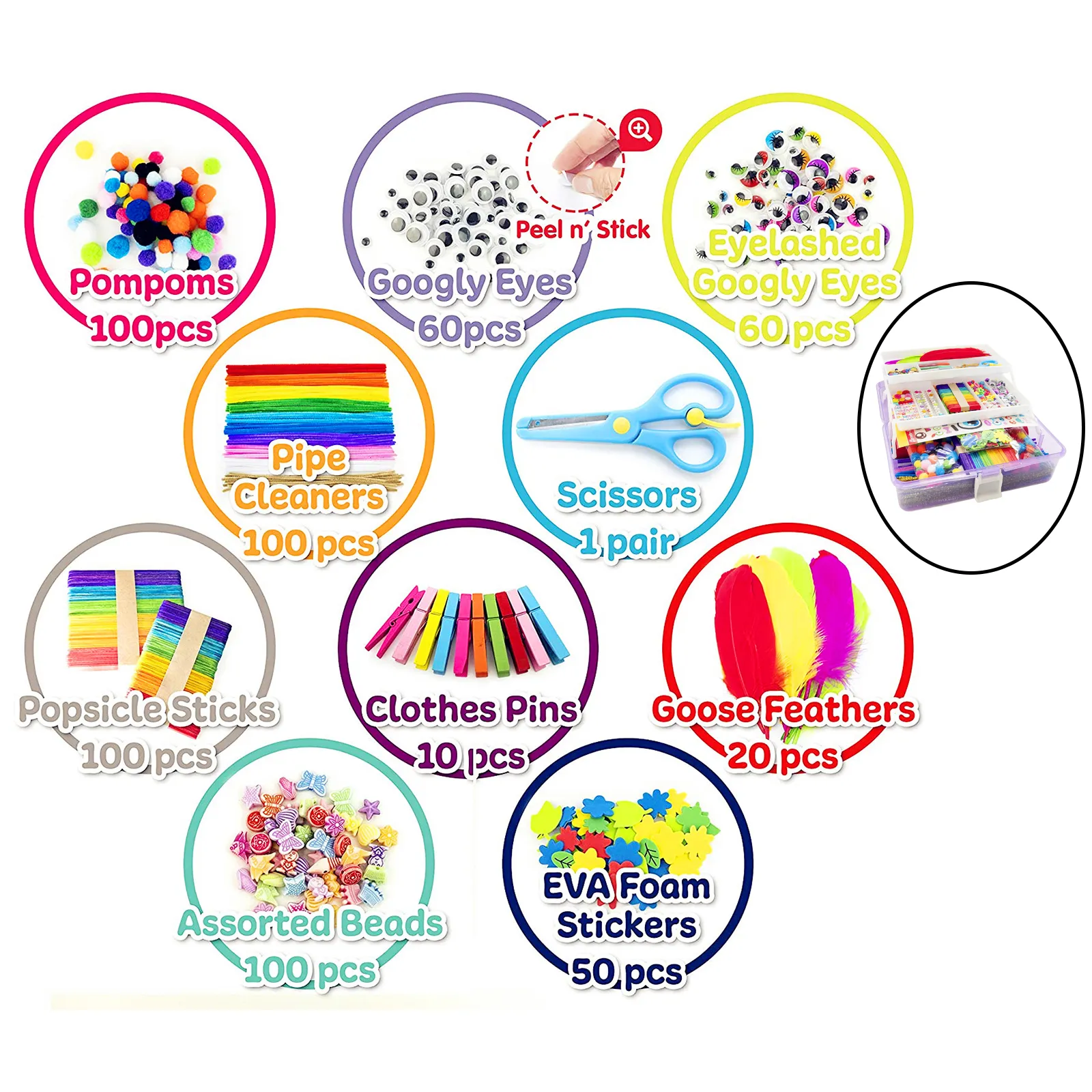 1000-piece set (including clips, scissors, toy eyes, colored wooden sticks, feathers, colored paper, etc.)