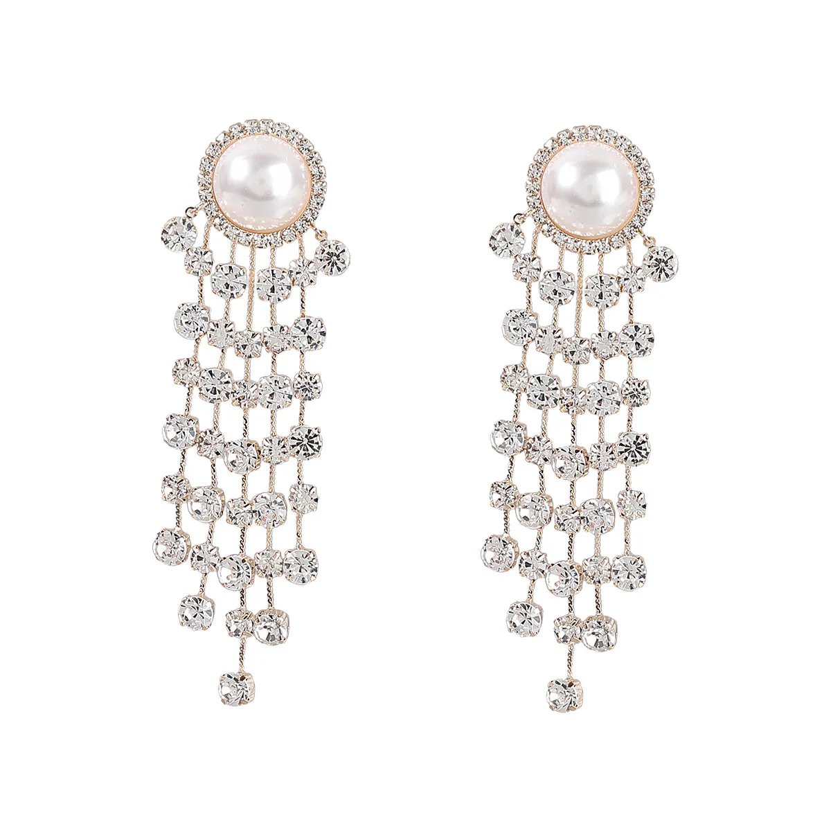 Creative Alloy Inlaid Pearl Diamond Rhinestone Long Fringe Earrings Female