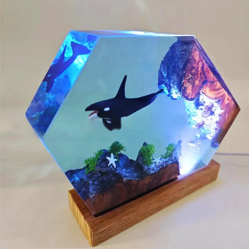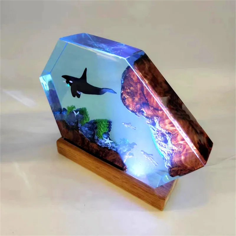 Crafted from high-quality resin and wood, this lamp is both durable and environmentally friendly. The wooden base adds a rustic touch, while the resin killer whale is beautifully detailed, offering an exquisite balance of art and functionality.