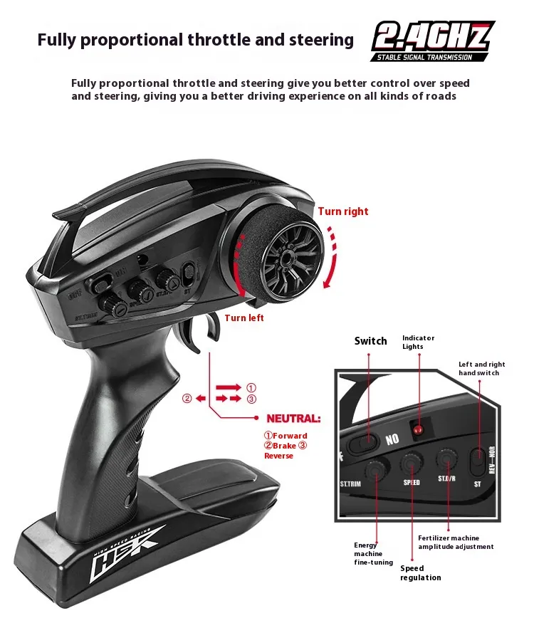 4. 2.4G full proportion synchronous remote control system Full proportional throttle/steering;