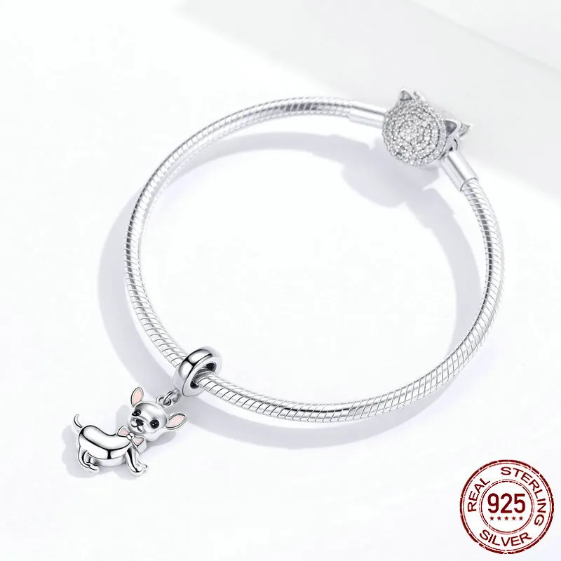 Cute Animal Chihuahua S925 Sterling Silver Pendant Fashion DIY Beaded Bracelet Necklace Silver Accessories SCC1317