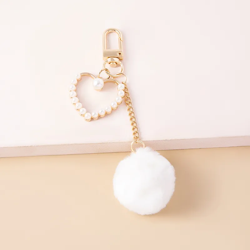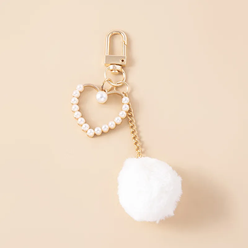 Cute White Plush Ball Keychain Fashion Pompoms Pearls Heart Charms Key Chain
