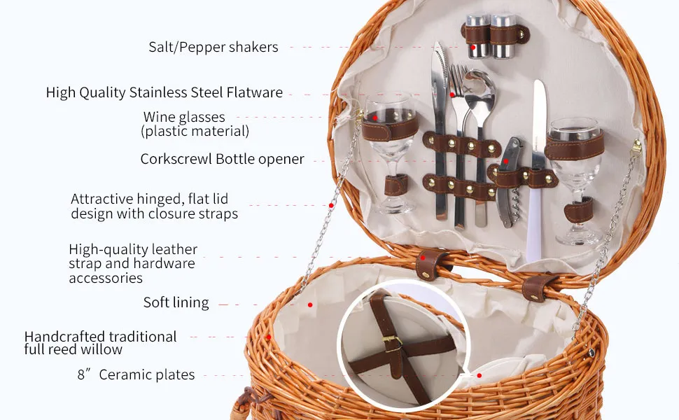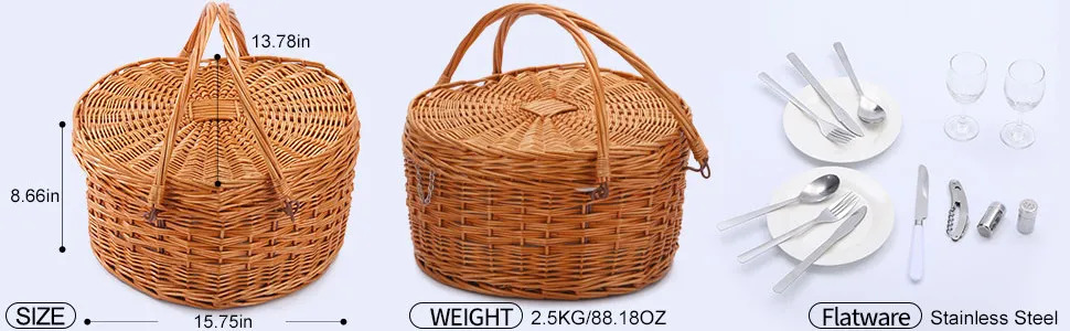 Durable Rattan Construction: Made from high-quality rattan, this picnic basket is strong, lightweight, and designed to