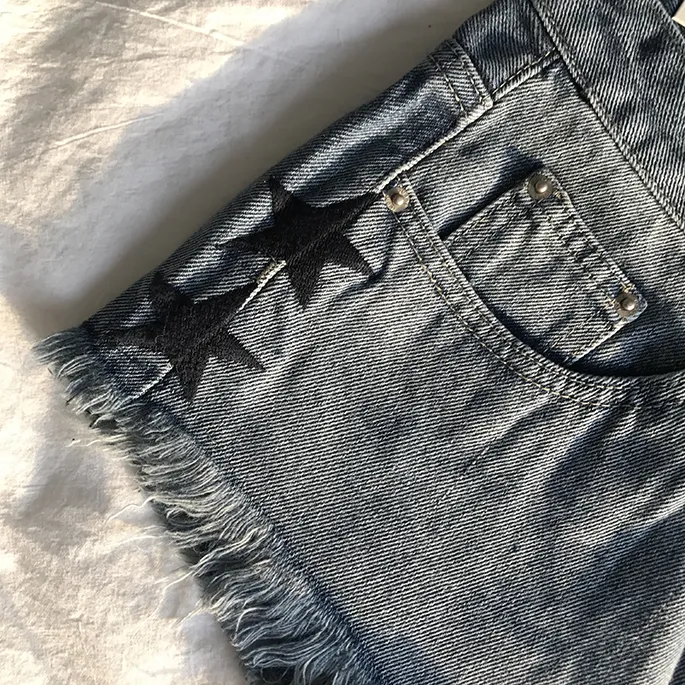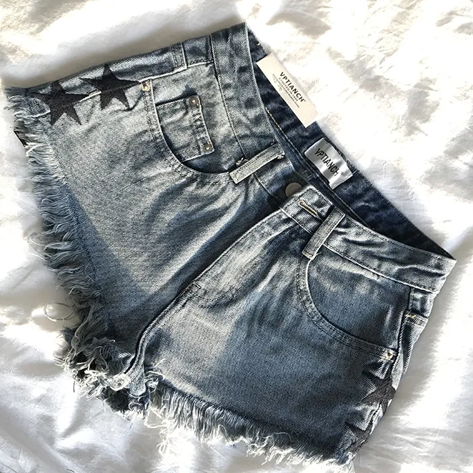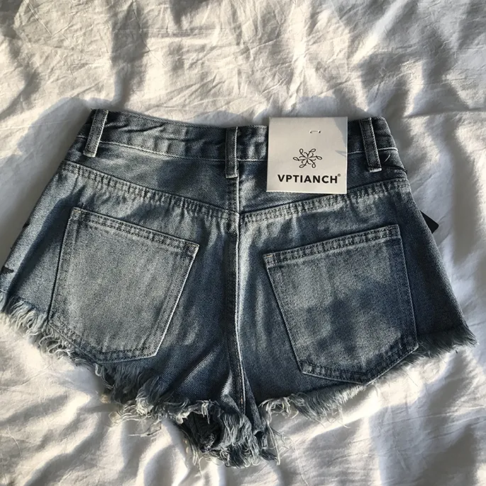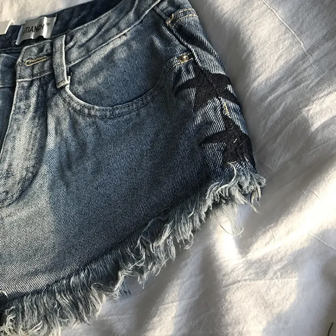Denim shorts, high waist, thin hips, super short hot pants trend