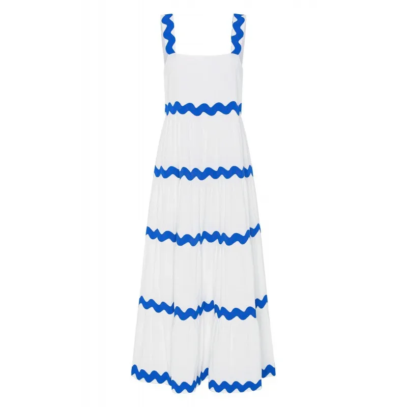 Color: blue and white suspenders dress, Rose red suspender skirt