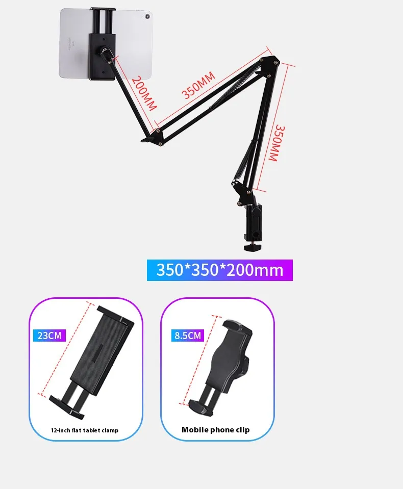 Structure: Generally adopts a three-section clip design, equipped with an 11-inch tablet clip, suitable for tablets of 12-18cm. Through the linkage of the three-stage mechanical arm and the universal ball head, flexible adjustment in multiple directions is realized.