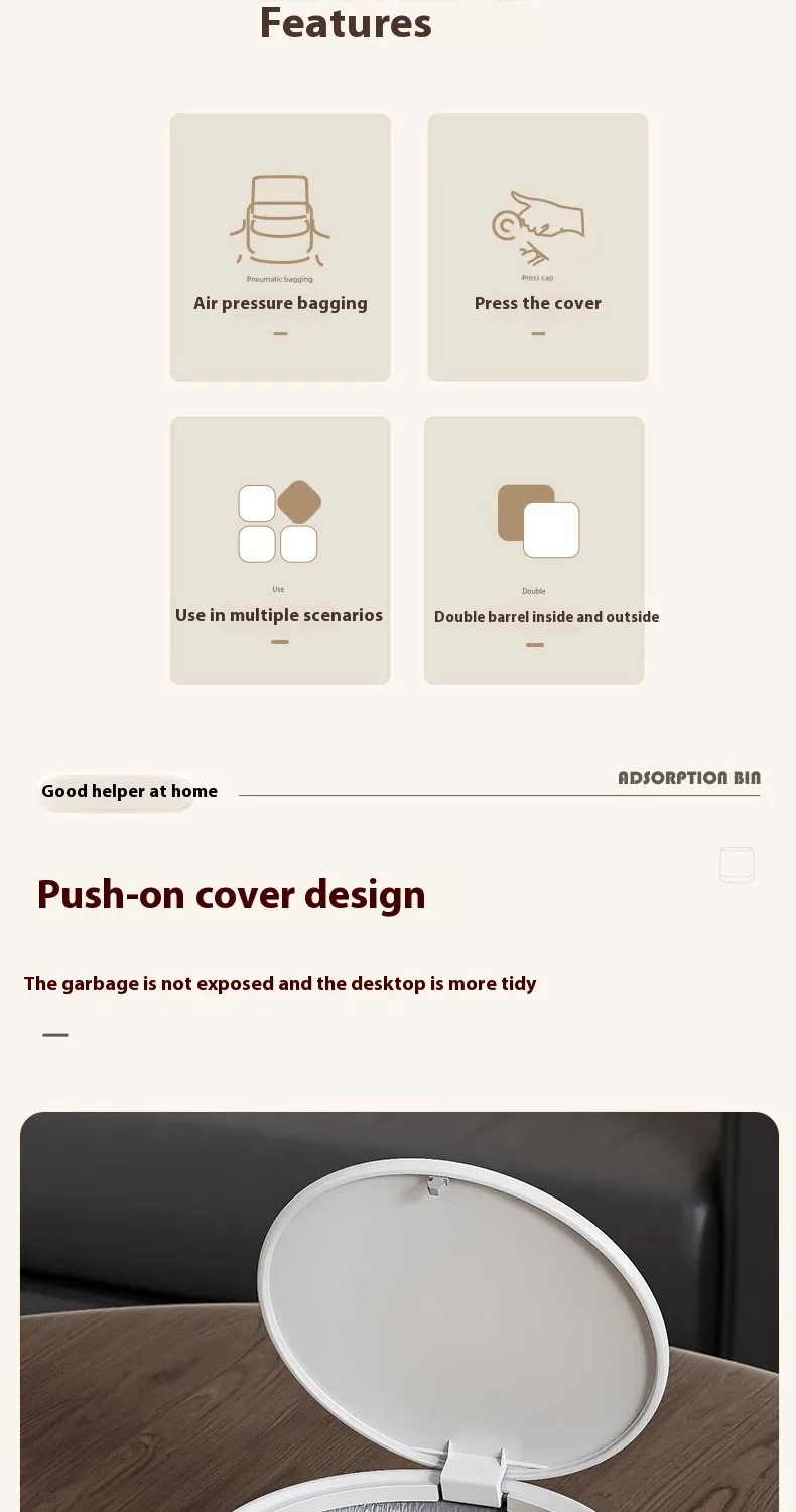 Designed with simplicity and elegance in mind, the desktop trash bin complements any décor. Its clean lines and neutral colors ensure it blends seamlessly into modern, minimalist, or even traditional interiors.