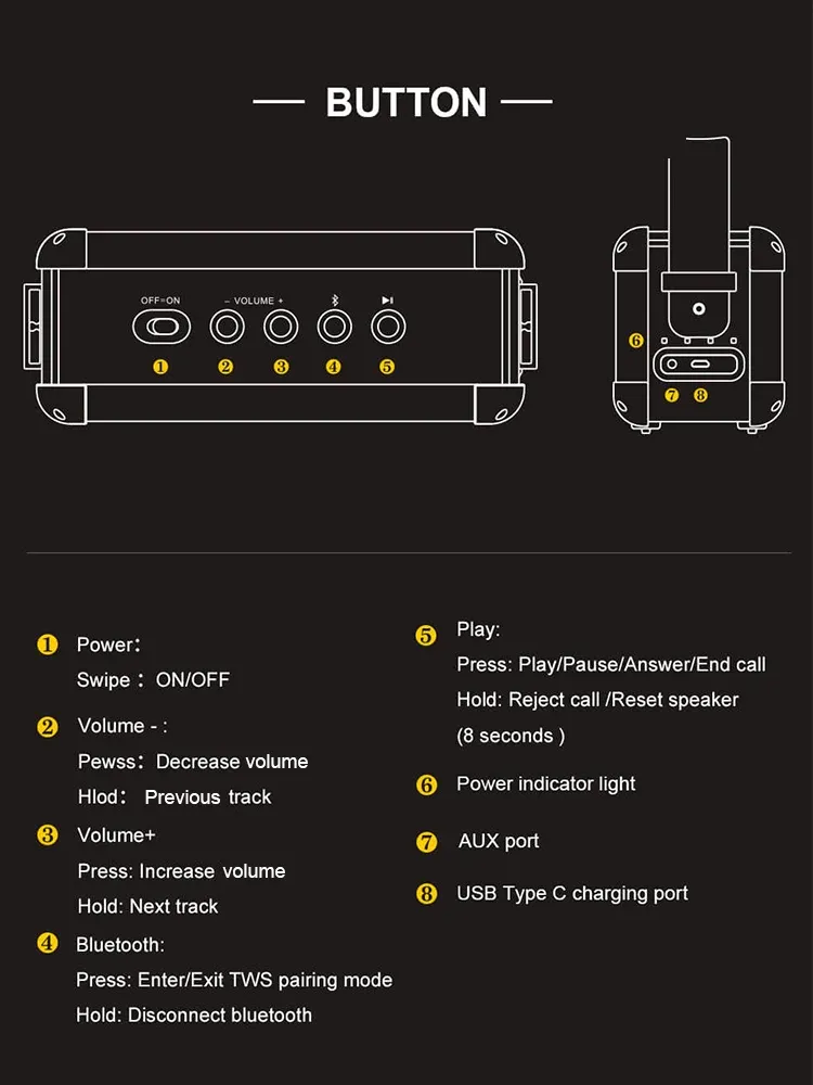 Multiple Playback Options: Supports Bluetooth, AUX, USB, and TF card playback for versatile audio sources.
