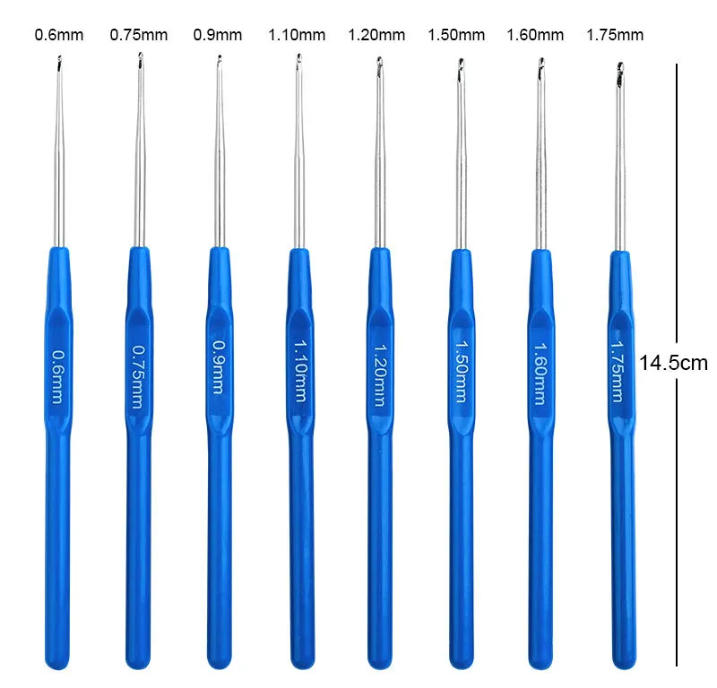 9 aluminum crochets with soft handles +8 lace crochets with blue handles +1 yellow scissors +1 white
