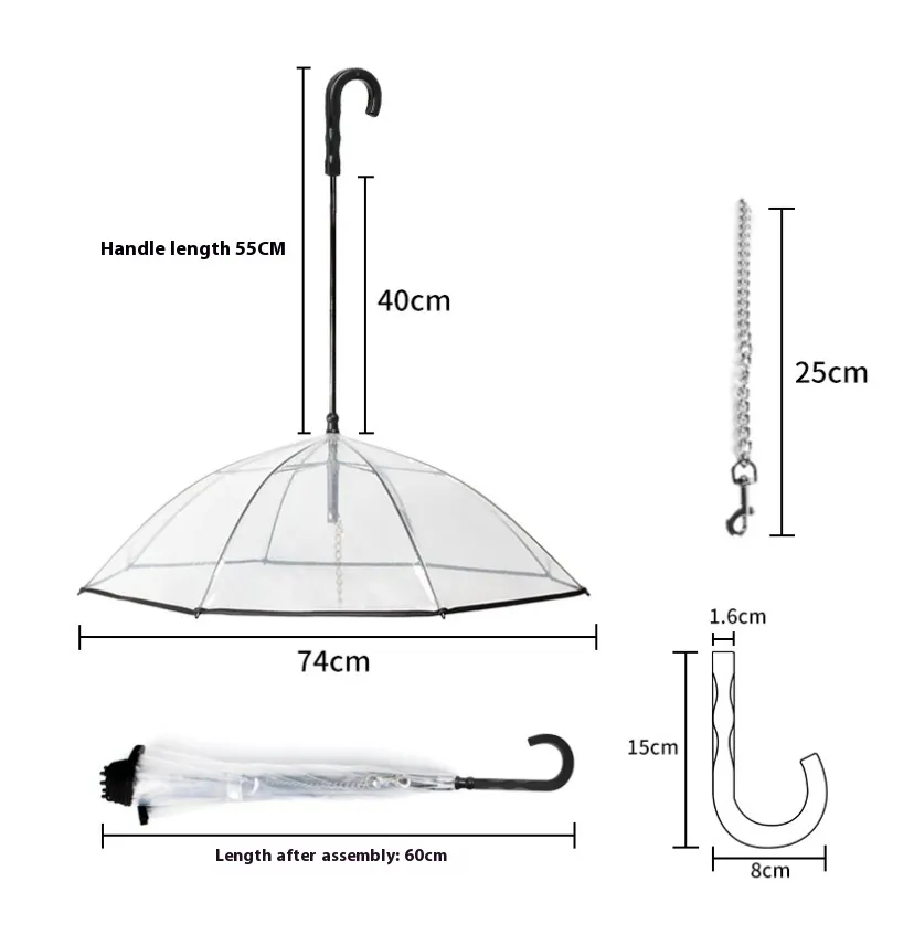 Choosing the Dog's Transparent Umbrella with Traction Chain means opting for an easy, convenient, and fashionable solution for walking your pet in rainy or stormy conditions. Traditional pet rain gear can be bulky, uncomfortable, or restrictive, but this umbrella offers a breathable and non-restrictive way to protect your dog while maintaining comfort and style.