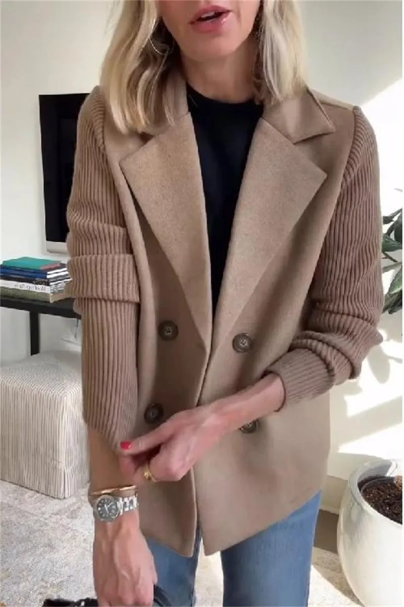 Double Breasted Lapel Jacket with Knitted Sleeves Splicing Design – Chic Outerwear for Women