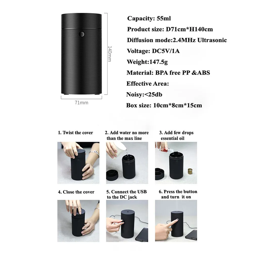 Ideal for cars, offices, small rooms, and travel, this portable aroma diffuser keeps the air fresh and humidified wherever you go.