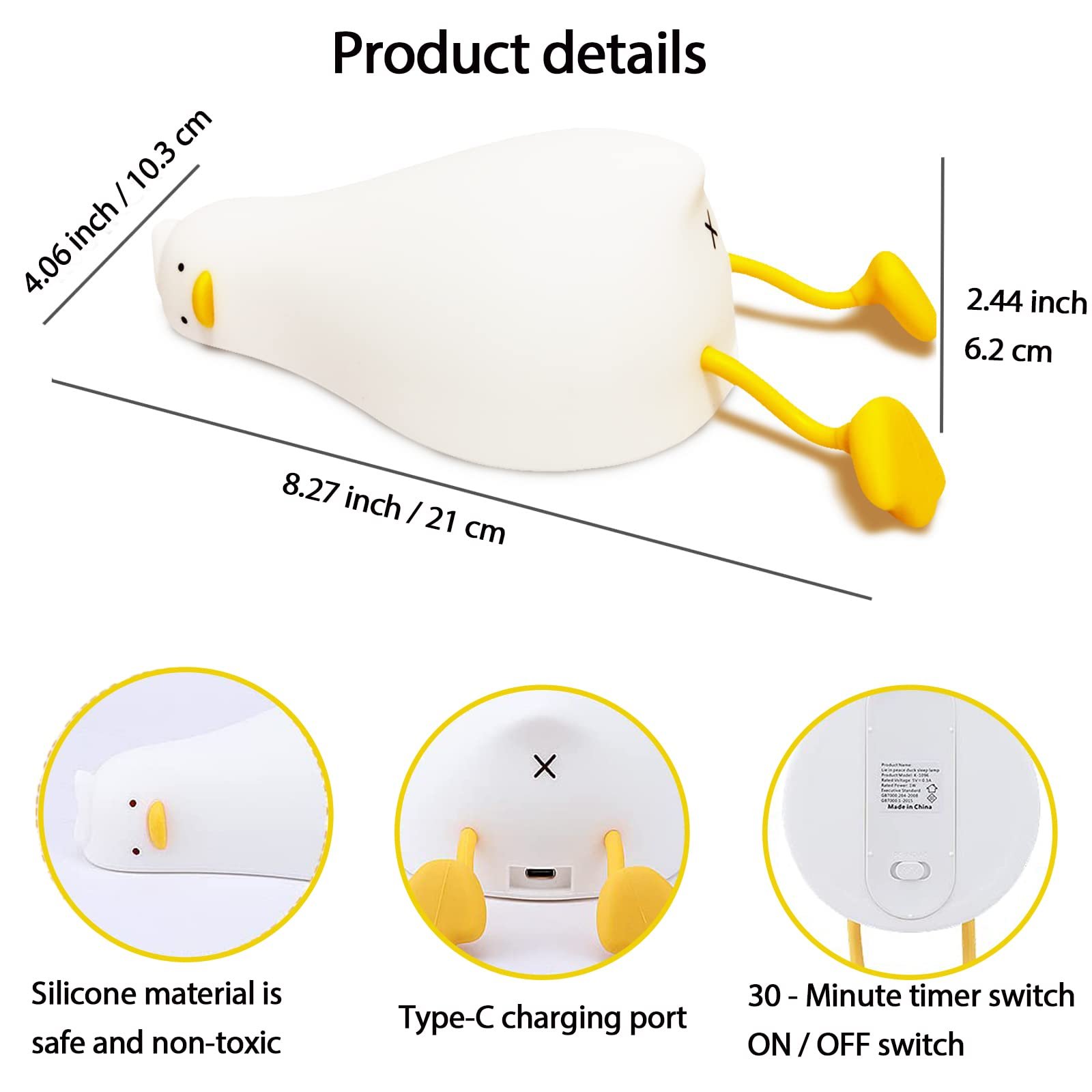 Note: Duck bottom and the USB charging port are not waterproof, not to enter water when cleaning. Do not repeatedly squeeze the duck night