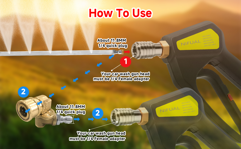 - Two multi-purpose quick couplings:One quick coupling can be rotated 180 degrees to solve the problem of low pressure due to the inability to bend,withstand a maximum of 2000PSI, comes with 1/4'Copper Quick adapter quick adapter,quick-connect design, universal interface to match most high-pressure water guns