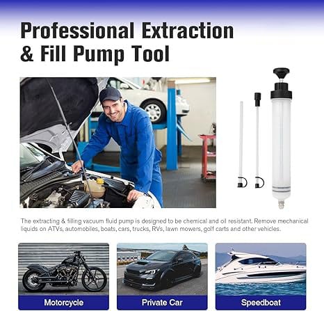 Ideal for extracting or replacing engine oil or lubricants in ATVs, marine vessels, agricultural equipment, industrial gearboxes, motor vehicles, motorcycles, RVs, and more. Suitable for engine oil, gear oil, transmission oil, including chemical resistant oil, brake fluid, diesel, coolant, hydraulic system and water.