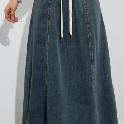 The A-line silhouette of the skirt ensures a flattering shape for all body types, elongating the legs and providing a relaxed yet stylish fit. The drawstring detail adds a modern touch to the classic denim design, making it a standout piece in any wardrobe.