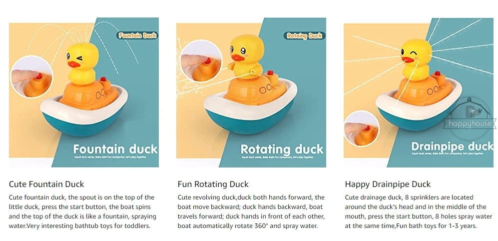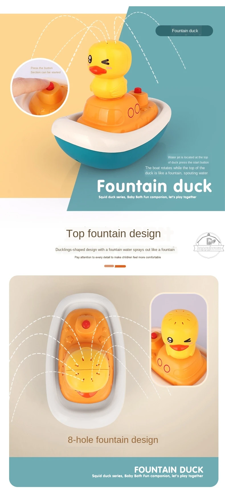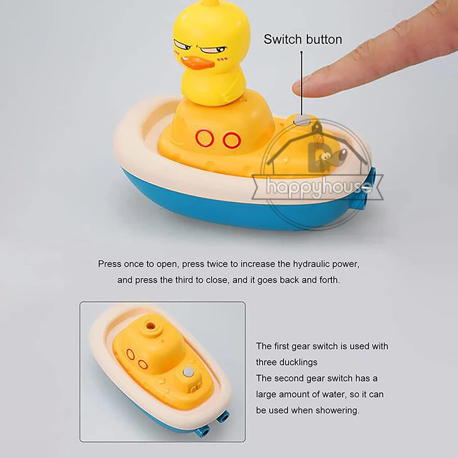 [3 different spray methods] - Bath toy packaging: boat *1, rotating duck *1, fountain duck *1, drainage duck *1. Turn on the switch of the