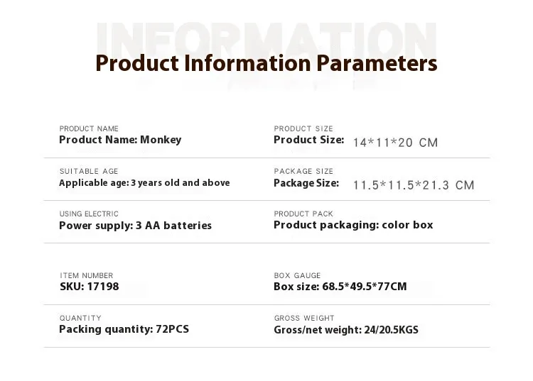 Not only does the Electric Music Light Dancing Monkey Toy entertain, but it also helps children develop important skills. The toy encourages motor skills as kids mimic the monkey's dance moves, improving coordination and balance. Additionally, the combination of music and movement promotes auditory and visual development, while the interactive nature of the toy supports social skills as children engage with the toy or play with others.