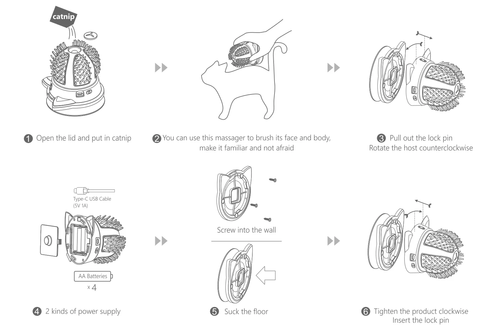- Function: Grooming Brush + Vibration Massage + LED Interactive Toy