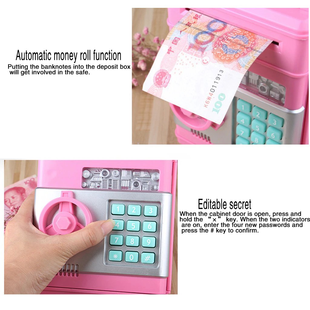 Features: 2 in 1 function: money saving box and password safe box. A unique bank that will not only help your kids save money, but also provide lots of fun! Two sound switchable: beeps sound and voice prompt. Automatic Rolling Banknote: Put your paper money into the roll slot, and it will automatically roll the money into the box.