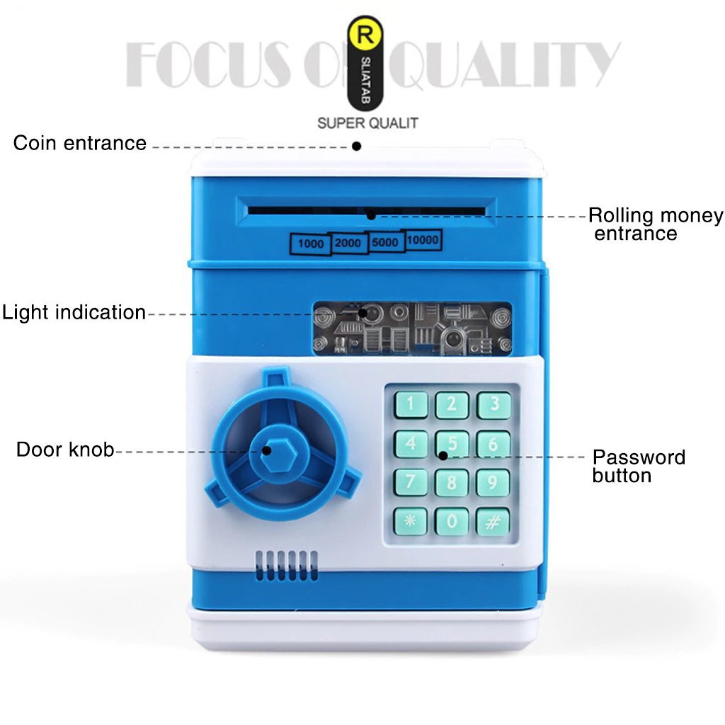 The Electronic Password Piggy Bank - Mini ATM is user-friendly and built to withstand everyday use by children. With a sturdy, durable construction, this mini ATM can handle frequent deposits and withdrawals, ensuring long-lasting enjoyment. The intuitive design allows kids to easily deposit and retrieve their savings while having fun.