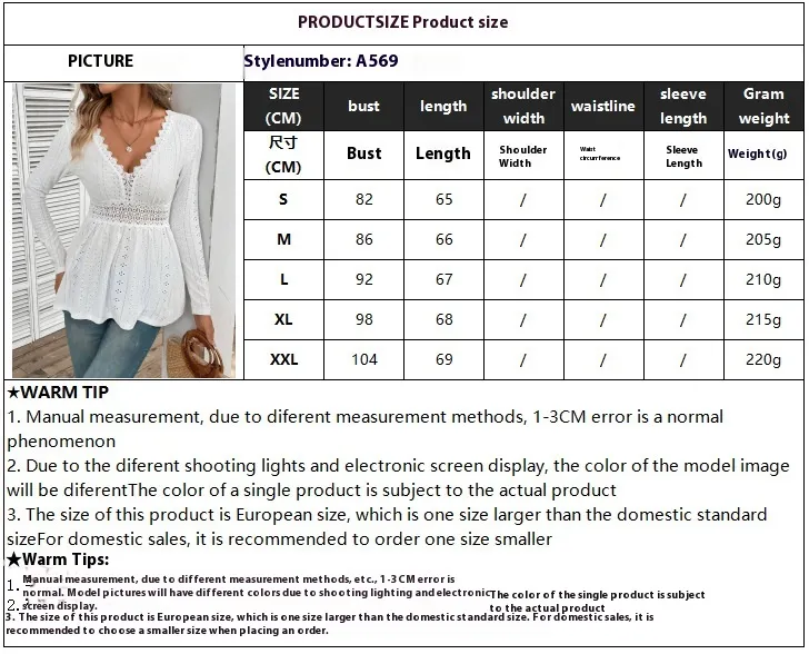 The Elegant and V-Neck Stitching Lace Long Sleeve Top is a stunning combination of sophistication and feminine charm. Designed for women who appreciate the finer details in their wardrobe, this top features a V-neck design that enhances the neckline and a delicate stitching lace that adds a touch of elegance. Perfect for both casual and formal occasions, this top seamlessly blends chic style with timeless sophistication, making it an essential piece for any modern woman’s wardrobe.