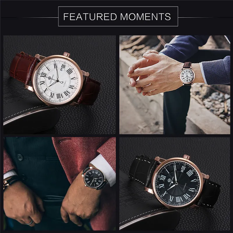 back cover provides a captivating view of the automatic self-winding mechanism, a feature adored by watch enthusiasts. The watch eliminates