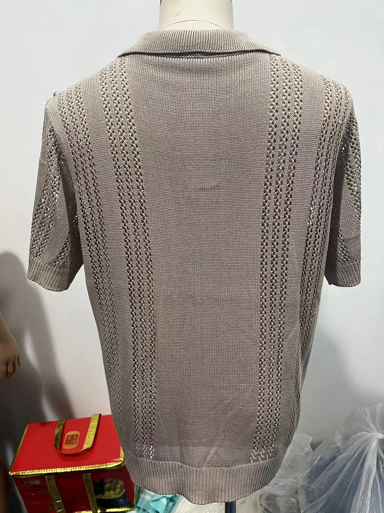 This knitted polo shirt is versatile enough to pair with a variety of outfits. Whether you're dressing up for a night out or keeping it casual during the day, this shirt is the perfect addition to your ensemble. It pairs well with jeans, chinos, or even shorts, making it a go-to choice for fashion-conscious men.