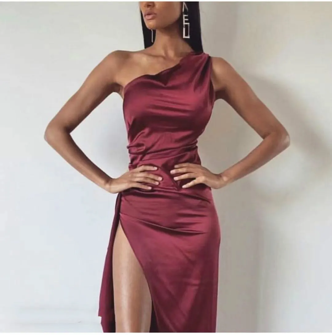 Make a statement with the European and American Satin Slant Shoulder Slit Irregular Sexy Dress, a stunning blend of contemporary design and luxurious fabric. This dress features a slant shoulder neckline and an asymmetrical hemline with a daring slit, creating a flattering silhouette that highlights your curves and adds movement to every step.