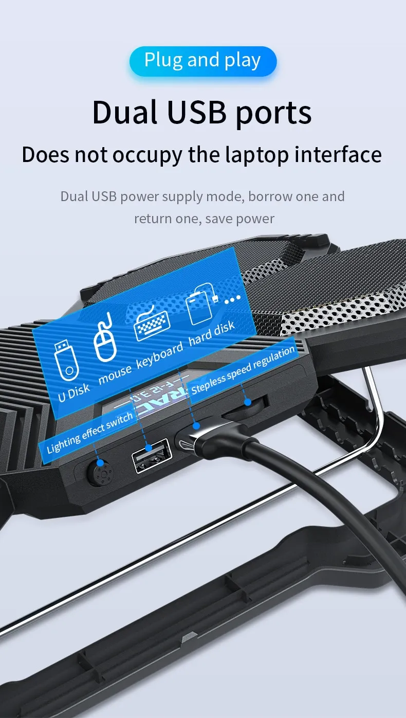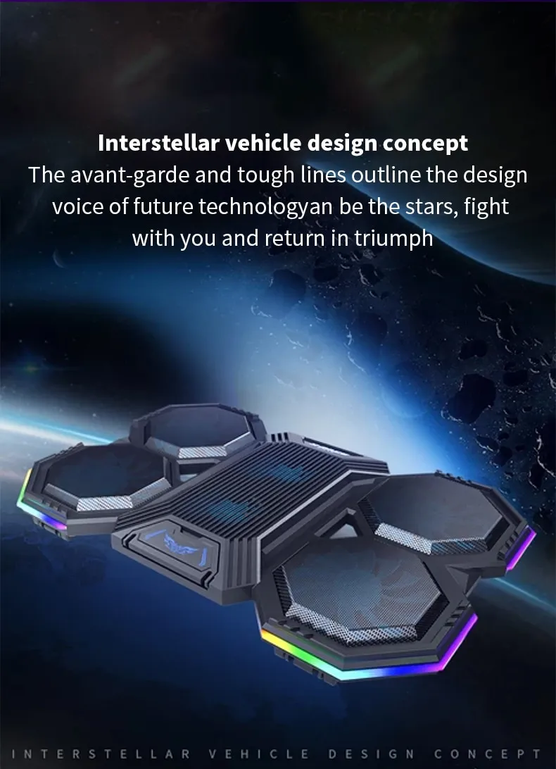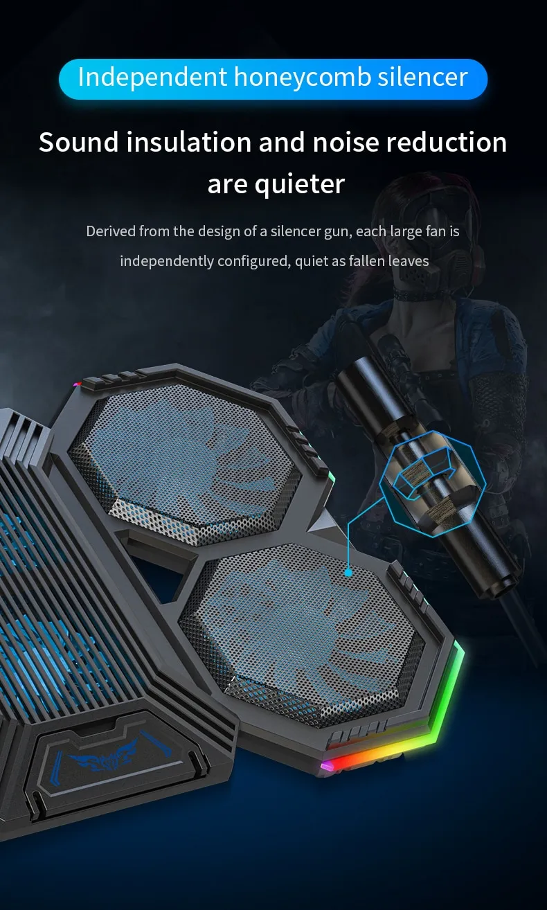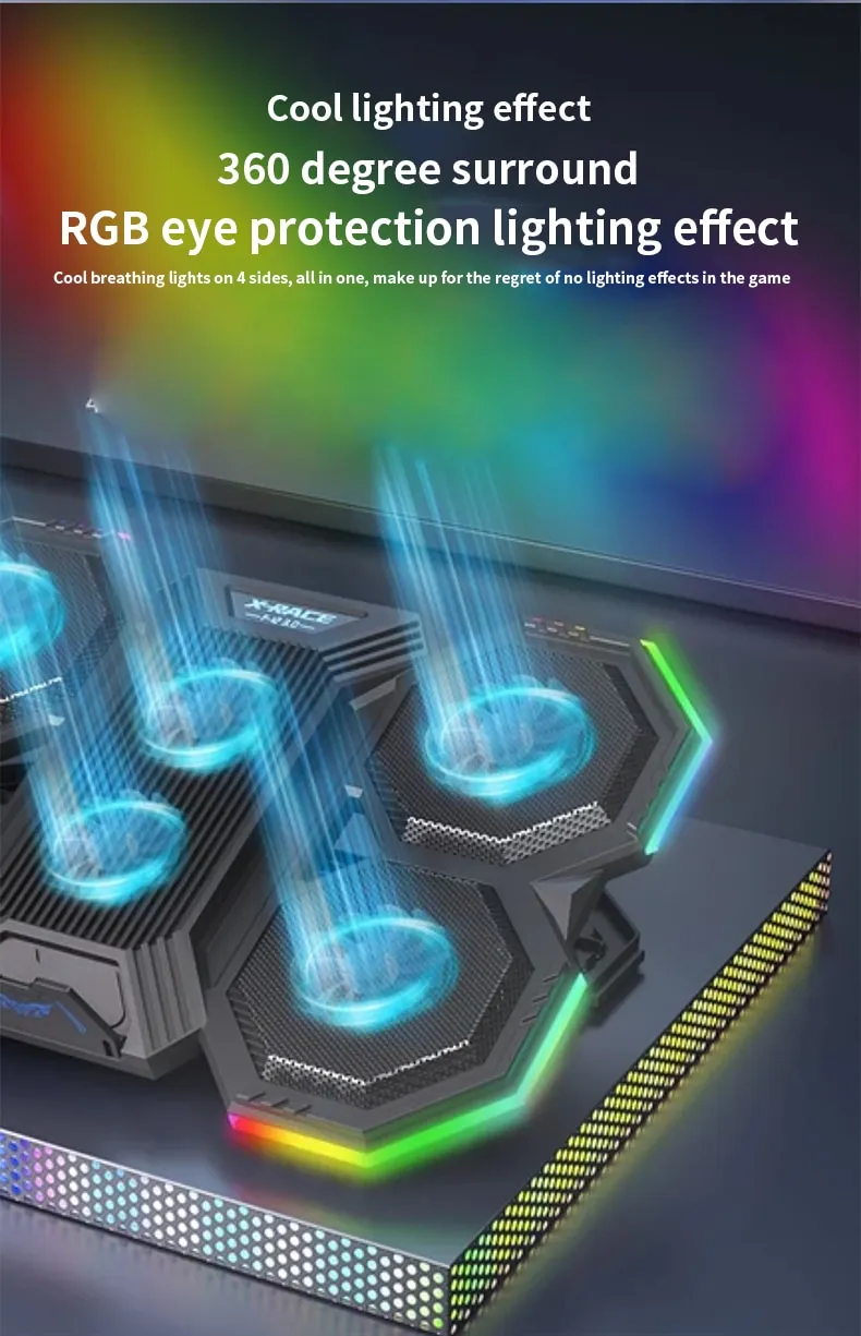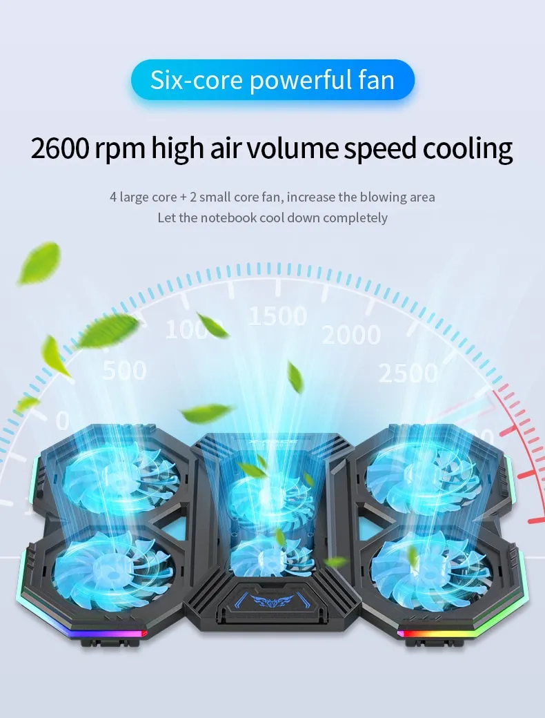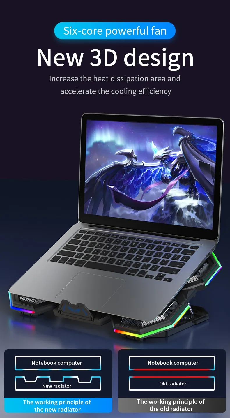 6 large fans provide super heat dissipation for the notebook computer, the button can adjust the wind speed freely, and the 360°RGB surround