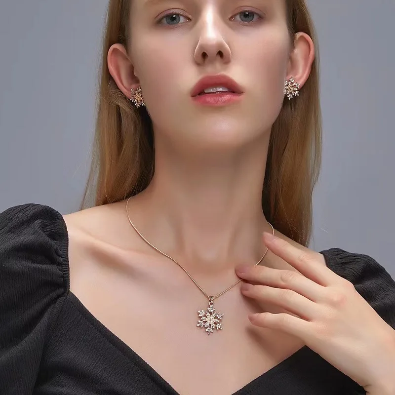 For a complete and coordinated set, this necklace pairs beautifully with matching snowflake earrings that mirror the pendant's delicate design. The earrings feature similar zircon stones that capture the light in perfect harmony with the necklace. Whether worn together or separately, they are sure to make a statement.