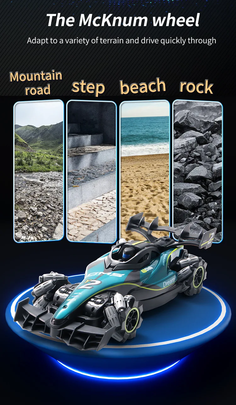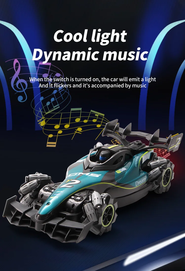 The spray stunt feature adds an exciting twist to the car’s capabilities. With the push of a button, the F1 RC car can release a mist or spray while performing stunts, adding a cool visual effect to your tricks and making the car even more fun to watch.