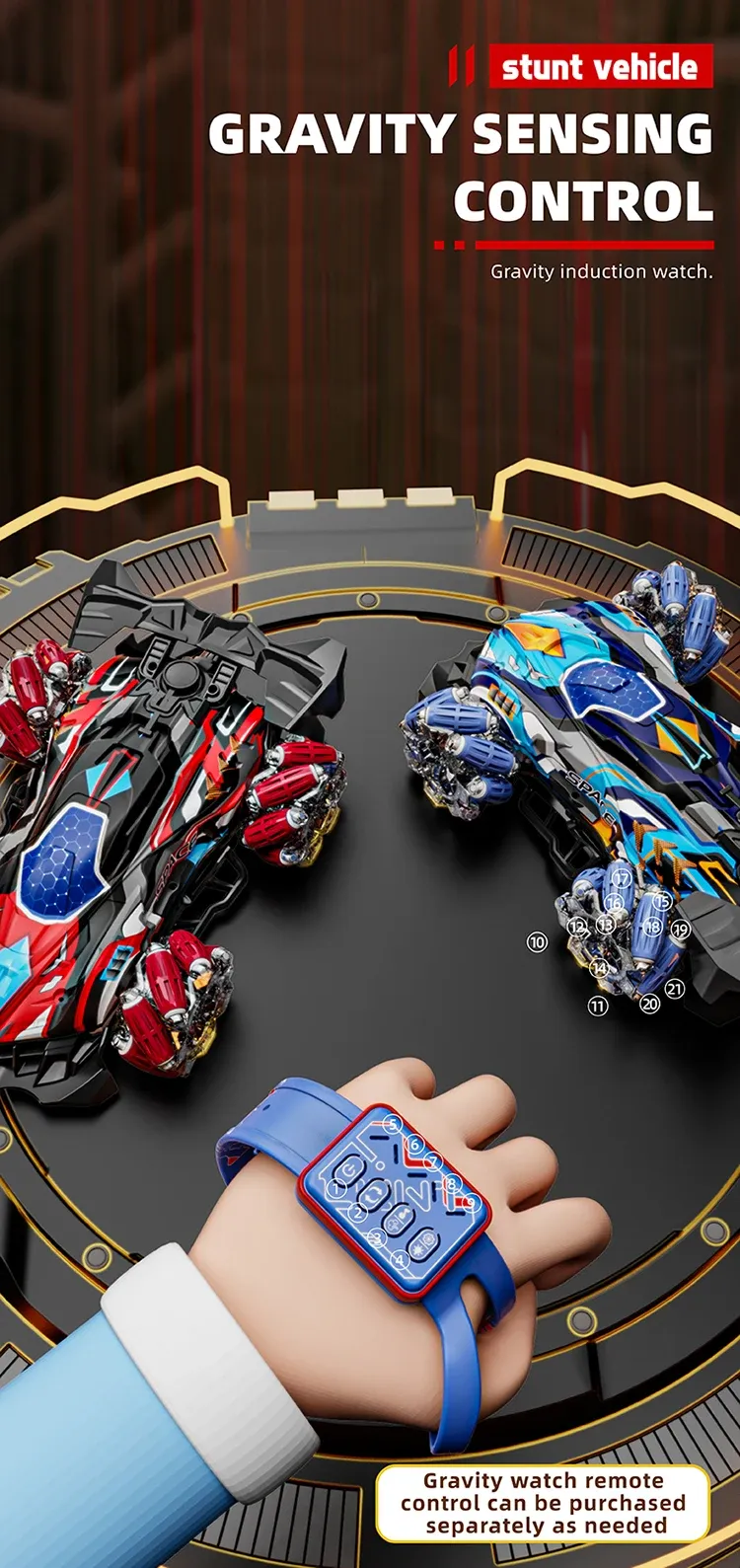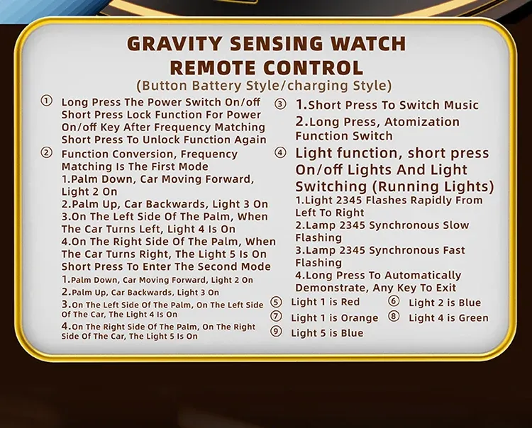 3. If you purchase a dual control version, when switching from a joystick remote control to a watch remote control, you need to turn off the joystick, turn off the toy car, and restart it. When the watch is turned on, it needs to be paired again. When switching from a joystick remote control to a watch remote control, it needs to be matched again according to the same principle.
