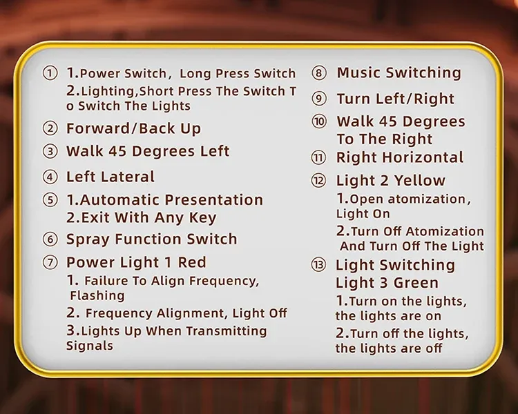 1. This toy is divided into dual control versions and single control versions. Single control refers to the product only being equipped with a handle remote control, while dual control refers to the product being equipped with both a handle remote control and a watch remote control;