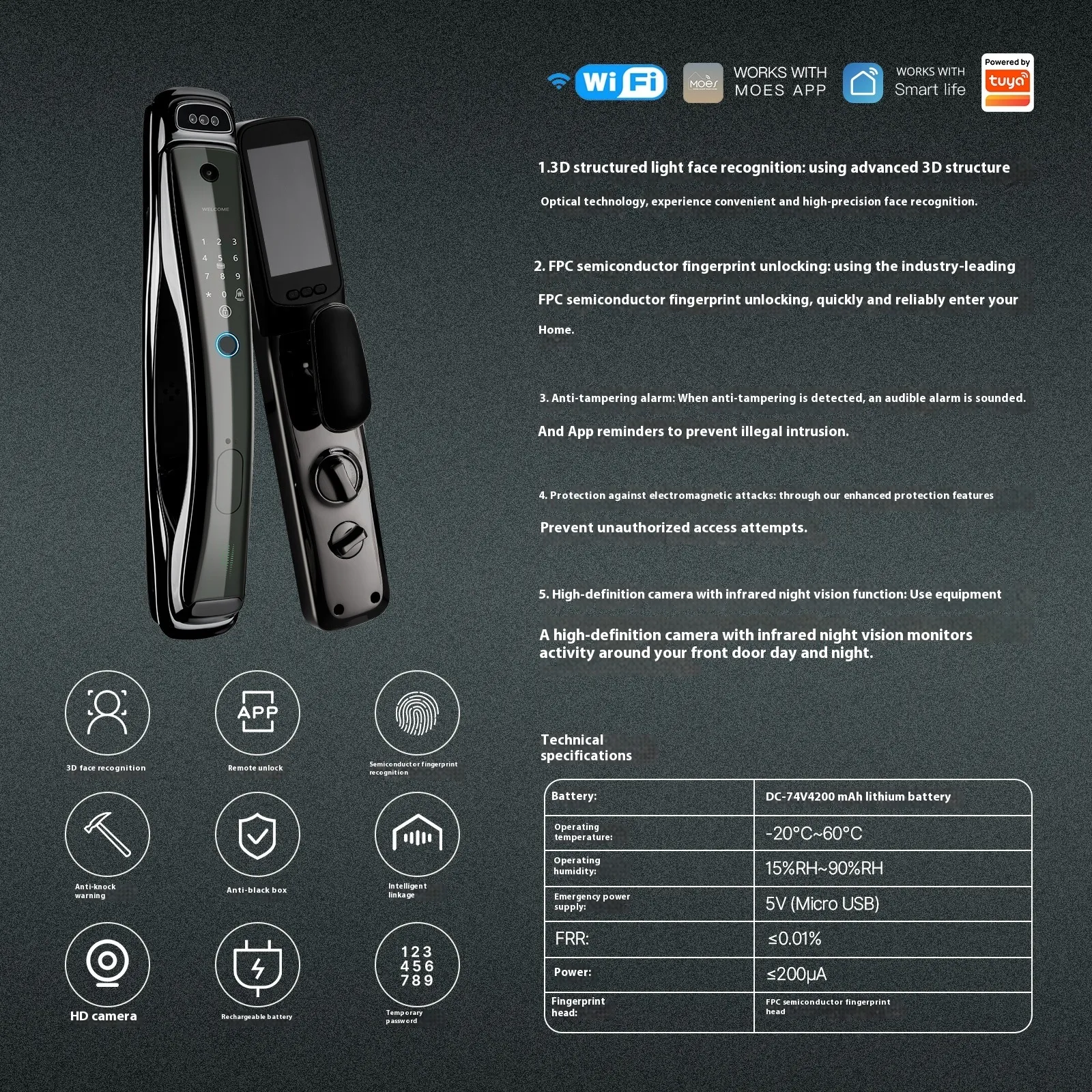 Equipped with an advanced infrared face scanning system, the lock provides accurate recognition even in low light conditions or when there are minor facial changes. The system uses AI-powered algorithms to compare the scanned image with stored data and make instant decisions. This ensures high security and reduces the risk of unauthorized access, all while offering seamless, fast operation.