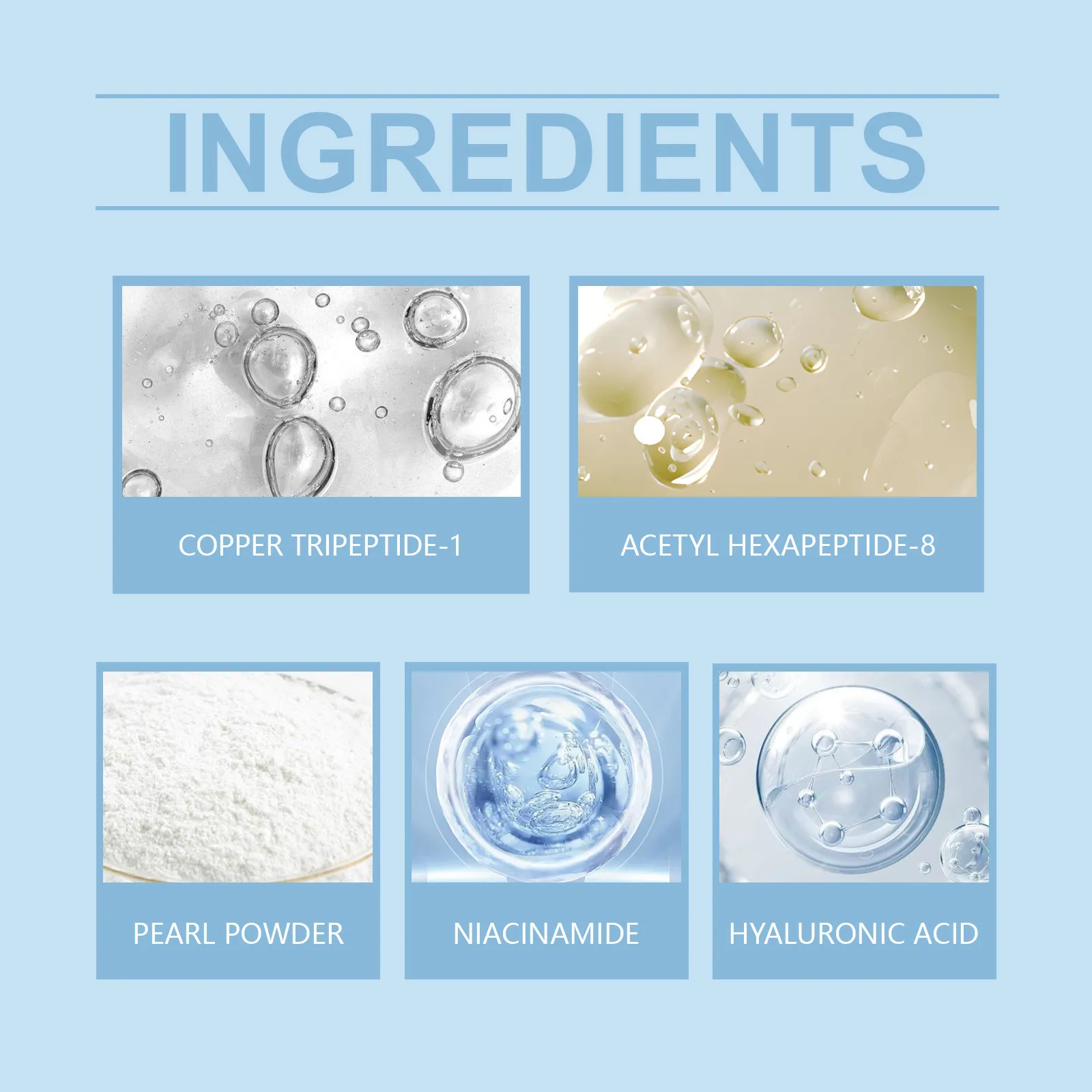 Product Ingredients: copper trie peptide-1, pearl powder, acetyl hexapeptide-8, transparent quality. Acid, nicotinamide