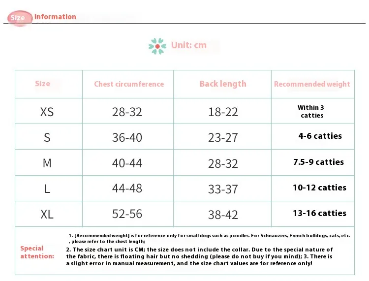 Size: XS-chest circumference 30 length 20cm about 1.00 kg-1.50 kg, S-chest circumference 35 length 25cm about 2.00 kg-3.00 kg, M-chest