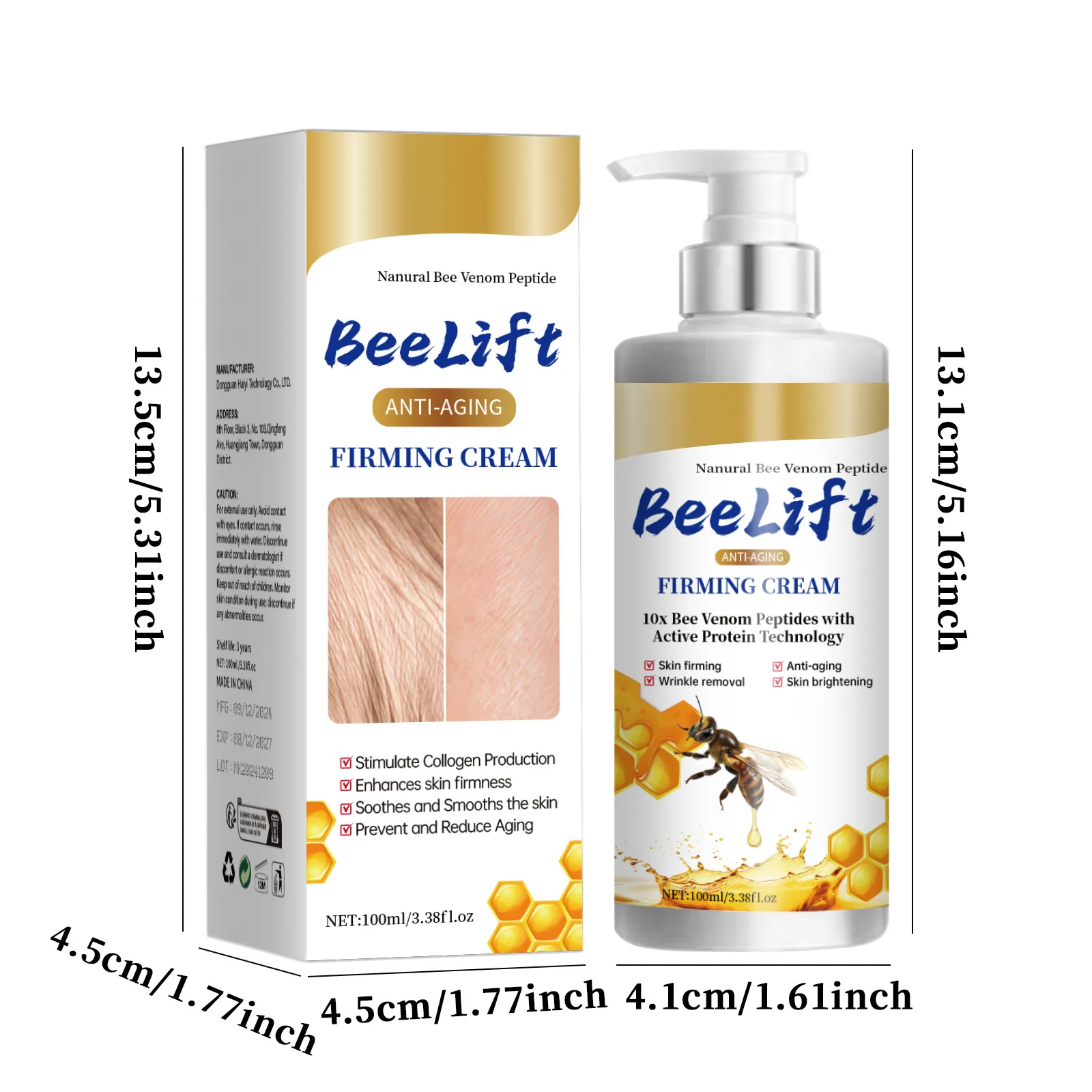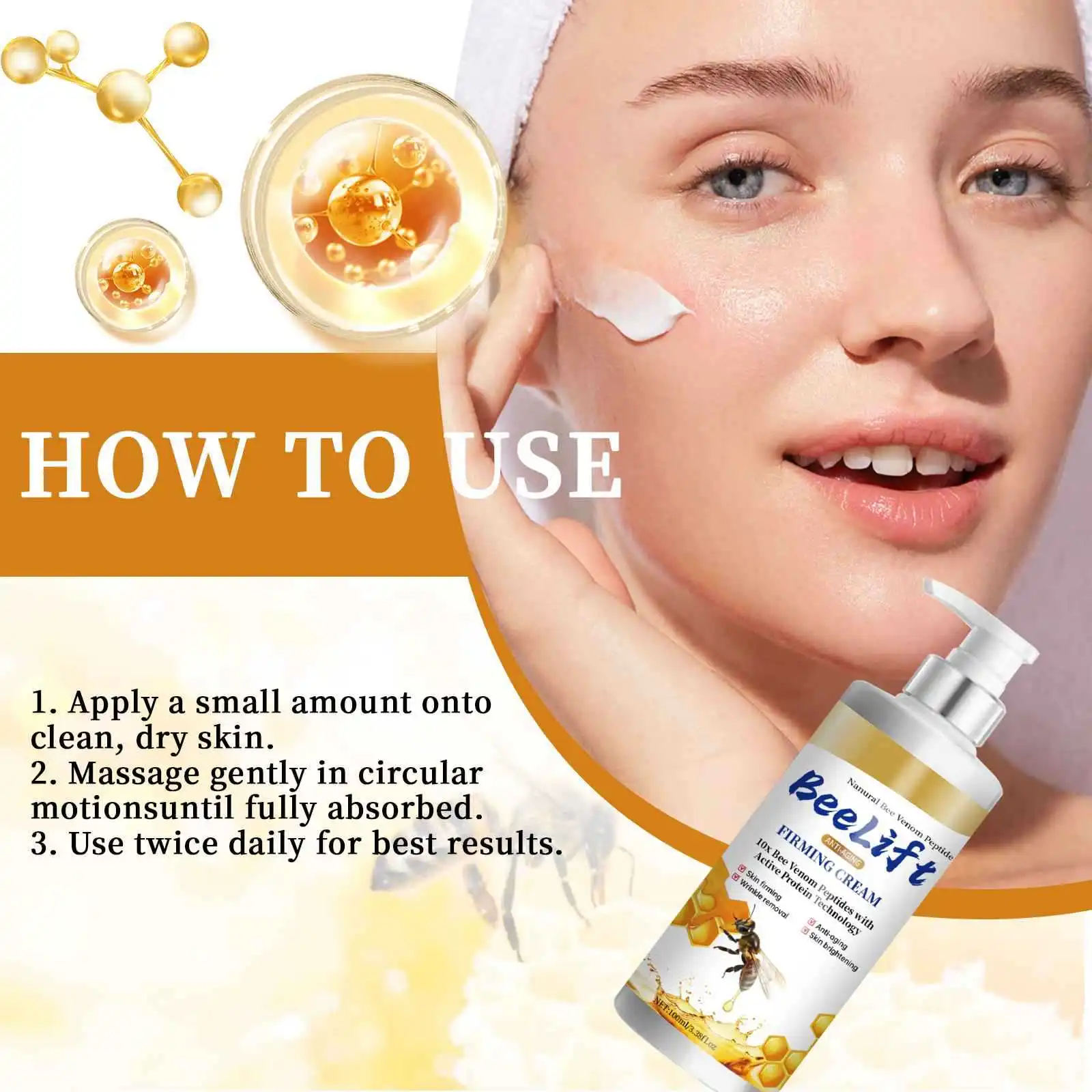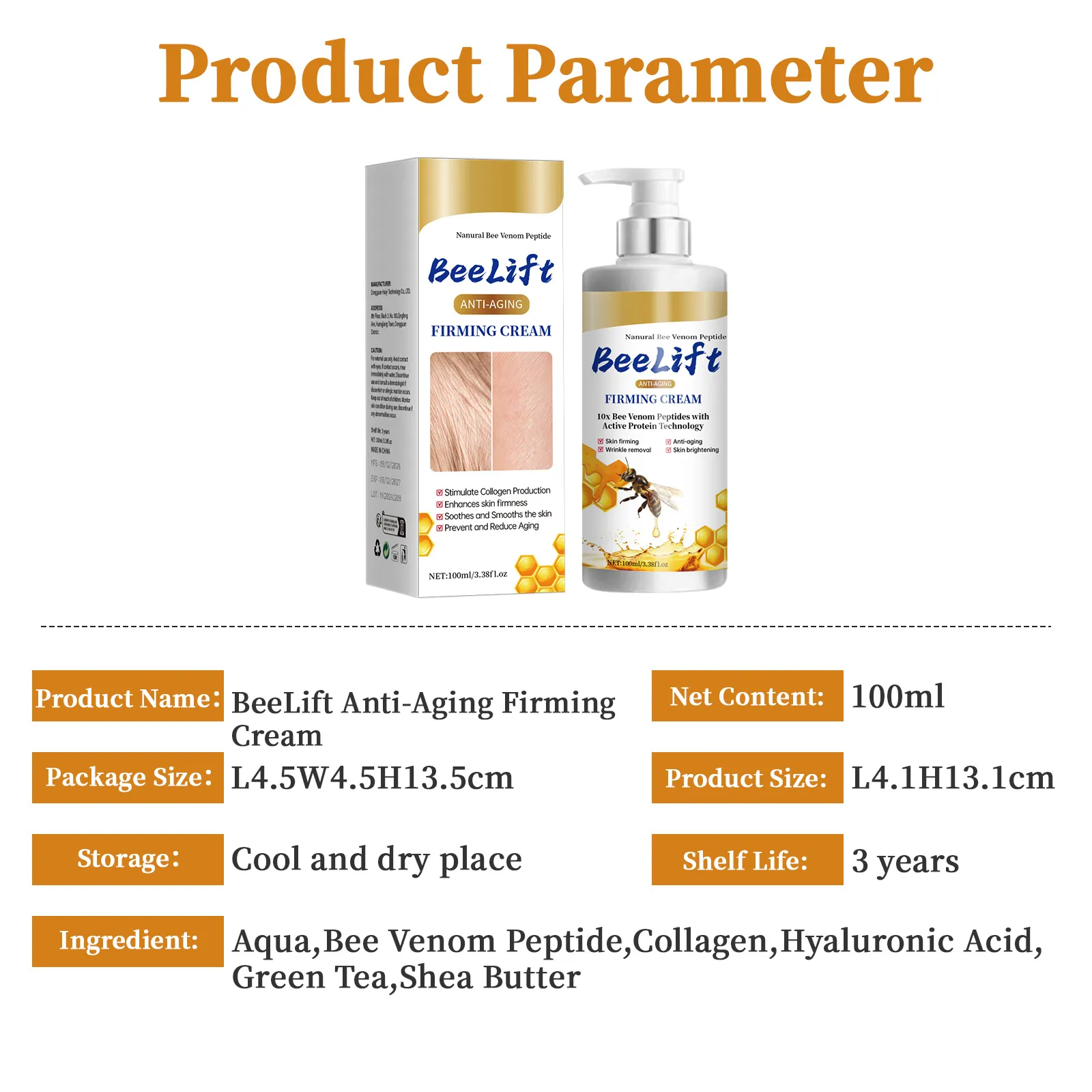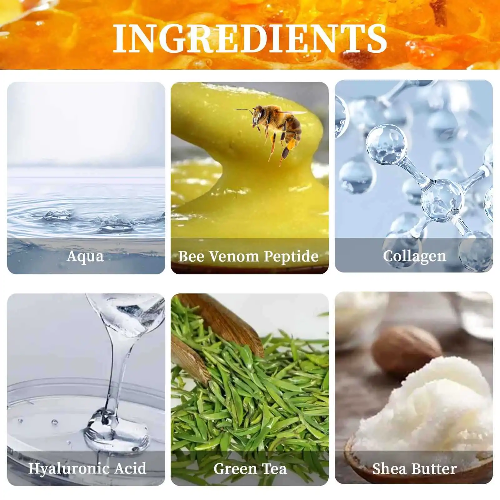 Ingredients: Water, Bee peptide · collagen, hyaluronic acid, green tea, shea butter