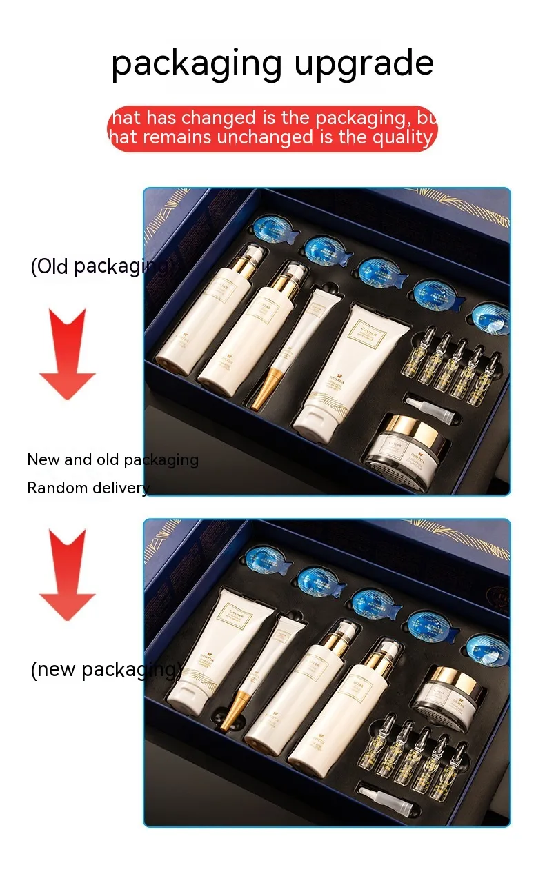 100g facial cleanser, 130ml moisturizing water, 130ml moisturizing milk, 2ml * 5 essence liquid, 20g eye cream, 50g moisturizing cream, 3.2g * 5 disposable sleep facial mask,