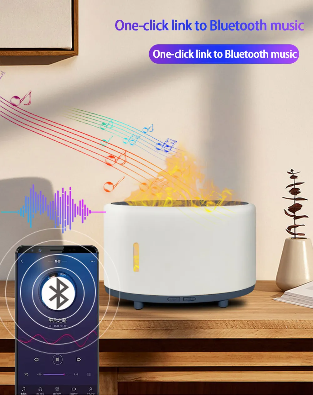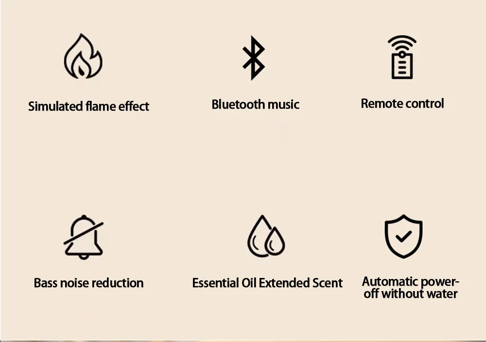 flame design. With Bluetooth remote control and a 150ml capacity, it's customizable and convenient for any space.