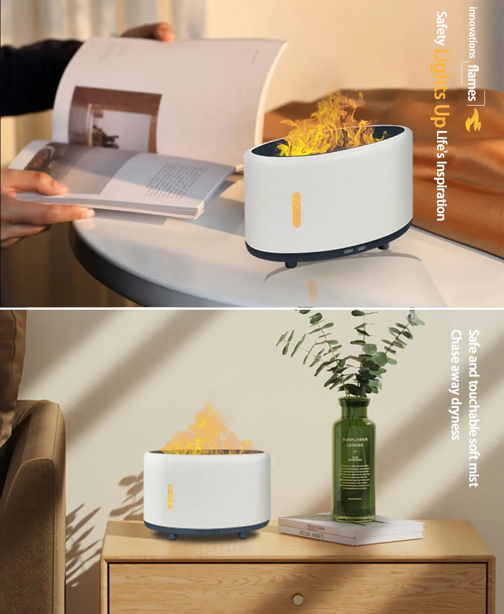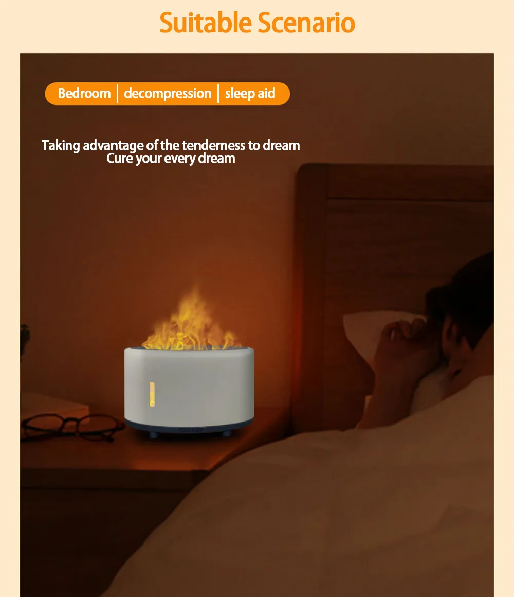 Elevate your relaxation with our Flame Humidifier. This 2-in-1 device combines a humidifier and aromatherapy machine with a mesmerizing LED