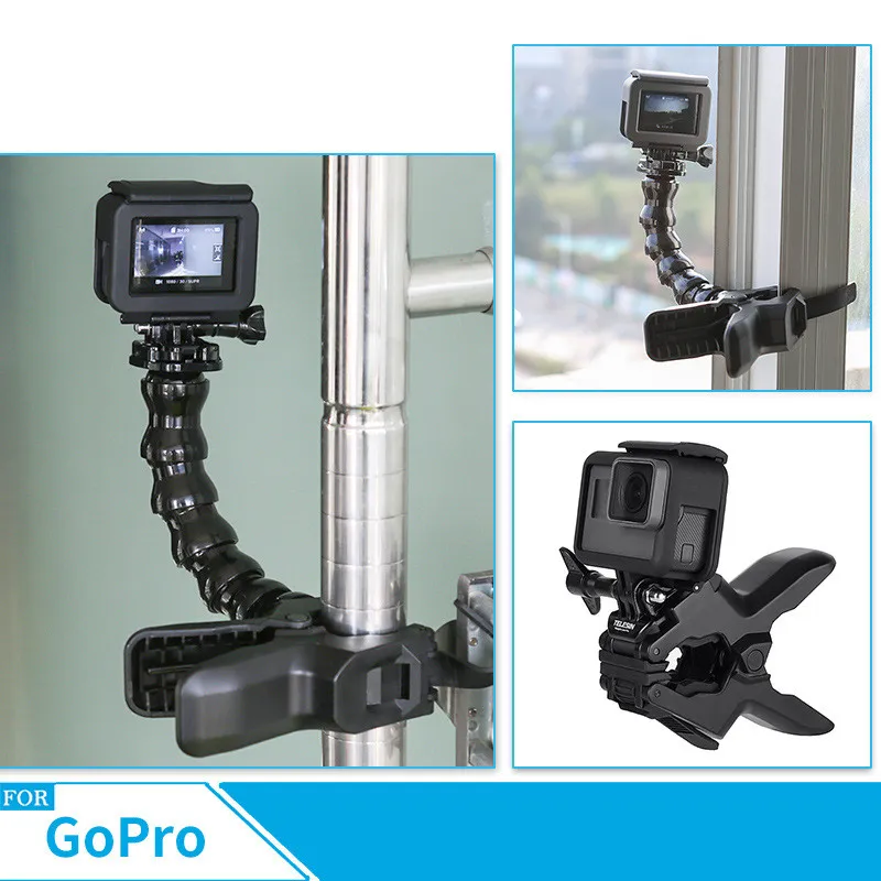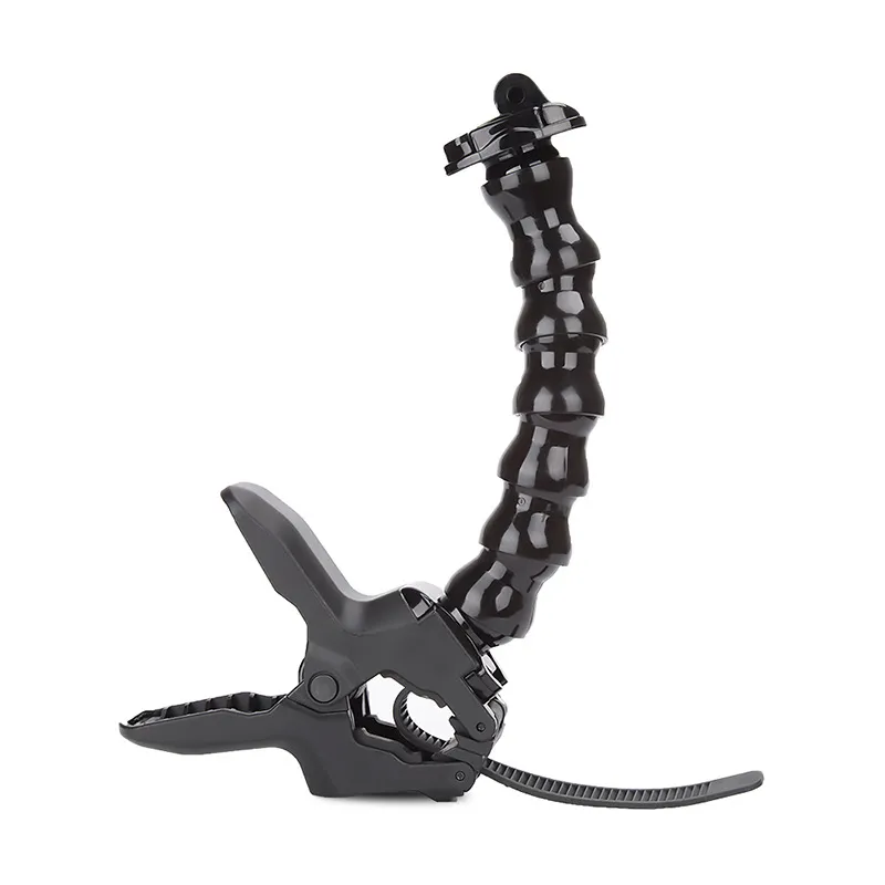 clip the camera directly to a flat surface, or use the optional curved neck for a wider range of camera angle adjustments. The gripper