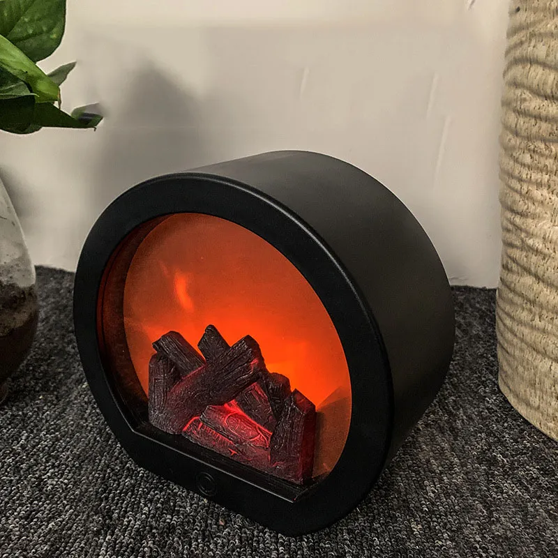 Realistic moving flame effect and the perfect for decorations, with logs and brushed retro style fireplace lanterns.