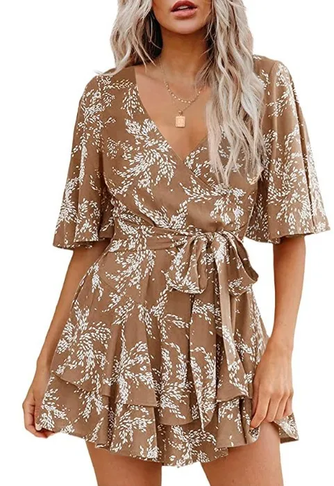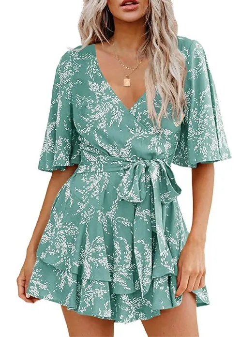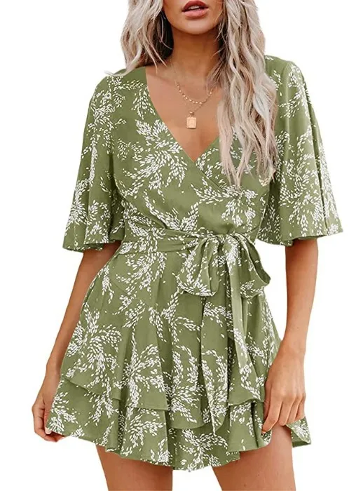 Floral V-neck Flare Sleeve Waist Belt-layer Pleated Dress