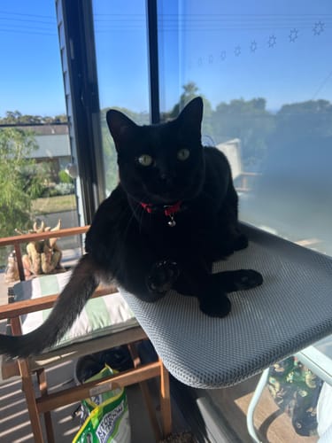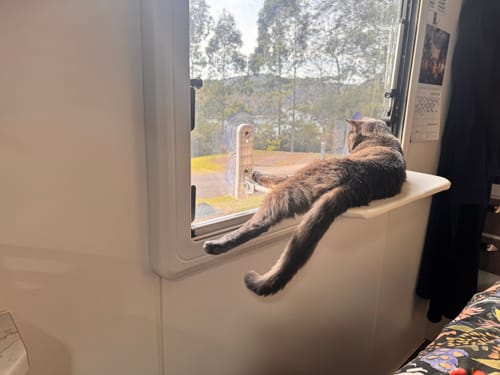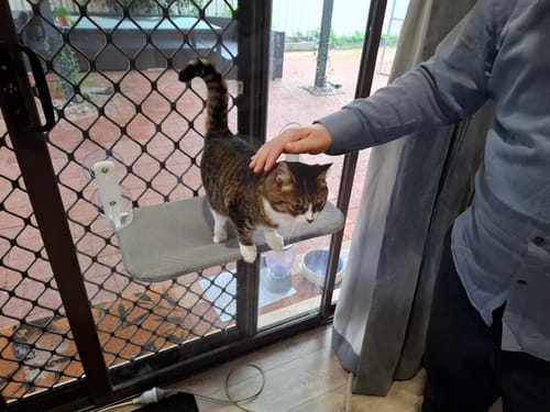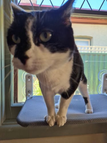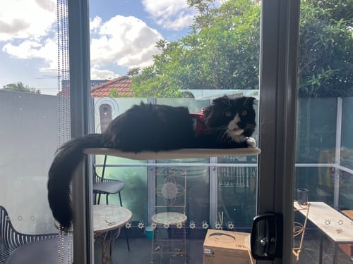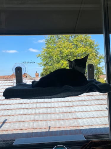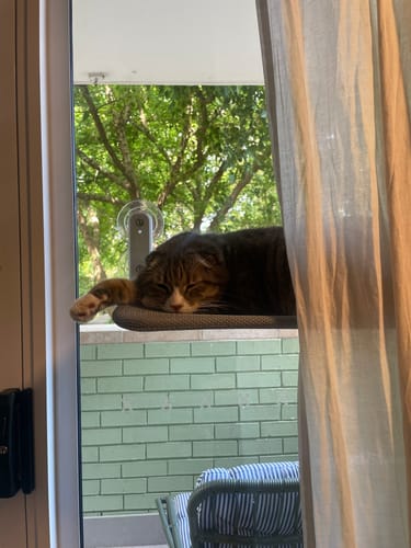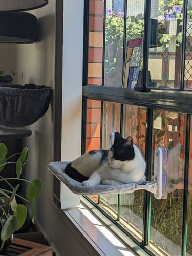 Ollie loves looking out the window to see what’s going on. He has a cat climbing house next to the hammock and he spends time on both. I