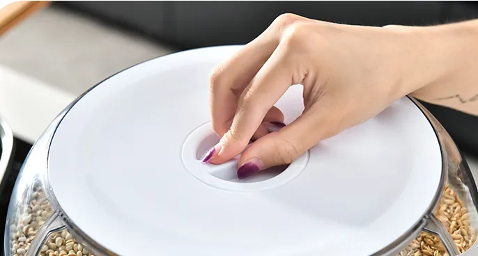 The container has 6 grids and can store whole grains, such as rice, green beans, red beans, barley, millet,