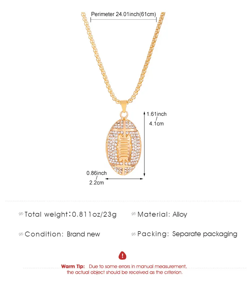 Introducing our Football Pendant Necklace, the perfect accessory for football fans and sports lovers alike. Crafted with attention to detail, this necklace features a beautifully designed football pendant that captures the spirit of the game. Made from high-quality materials, it offers durability and style, making it suitable for everyday wear or special occasions. The pendant hangs elegantly on a sturdy chain, ensuring a comfortable fit. Whether you're heading to a game, hanging out with friends, or looking for a unique gift for a fellow football enthusiast, this necklace is a fantastic choice. Celebrate your love for football and elevate your accessory collection with this charming pendant necklace!