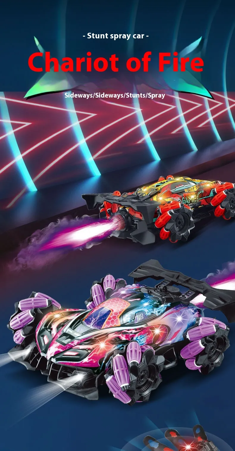 Bright LED Lights: The Four-wheel Spray Remote Control Car is designed with vibrant LED lights that