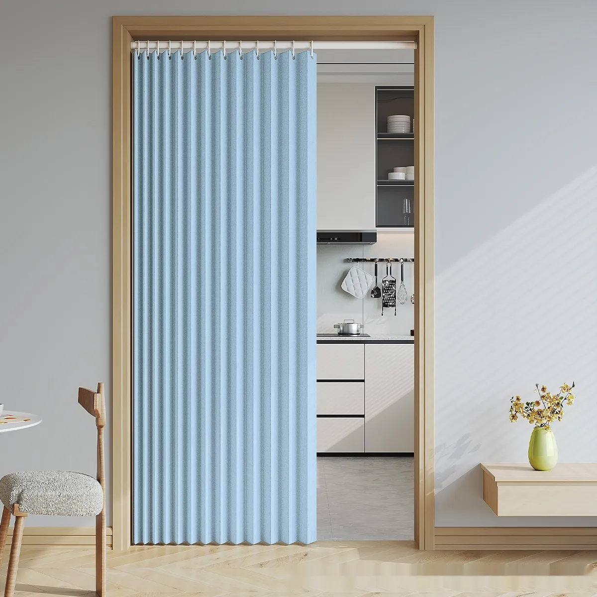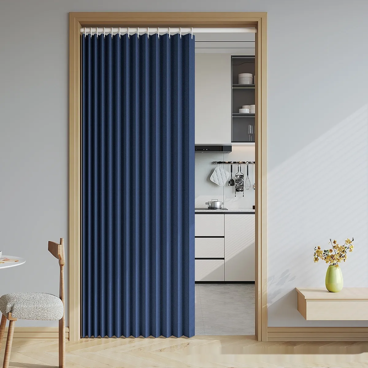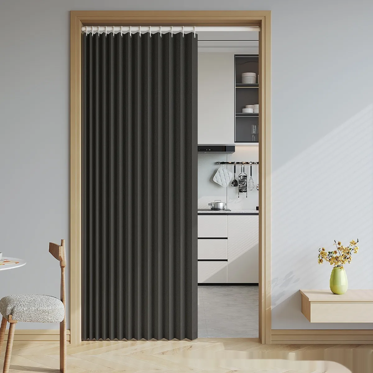 vibrant shades or textured fabrics, the curtain material can enhance the aesthetic of your room. The sleek design of the divider complements